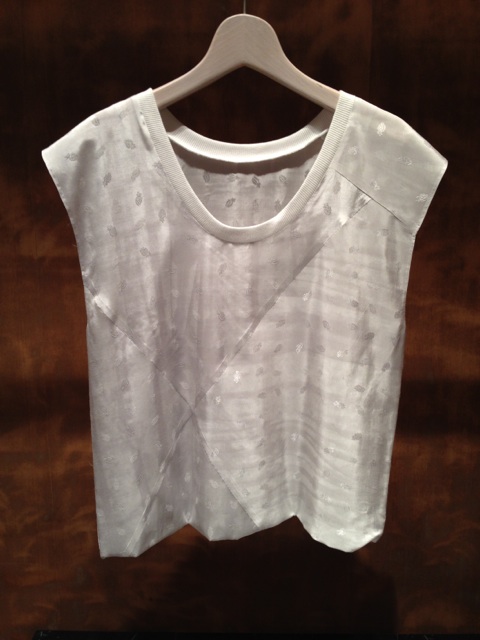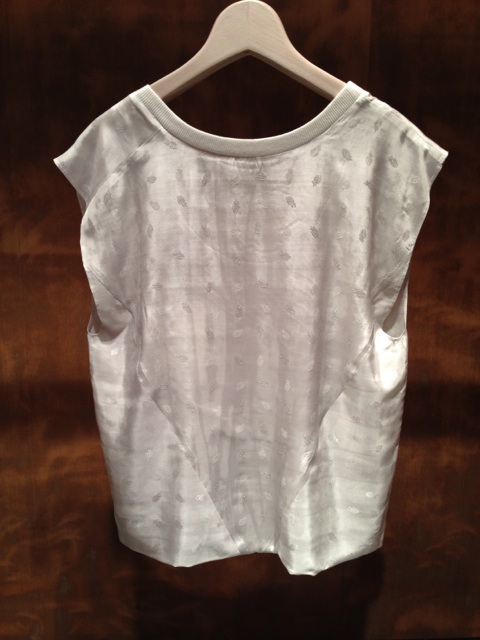 オリジナル柄のジャガード織りに、染めプリントを施したテキスタイルを使ったトップス。