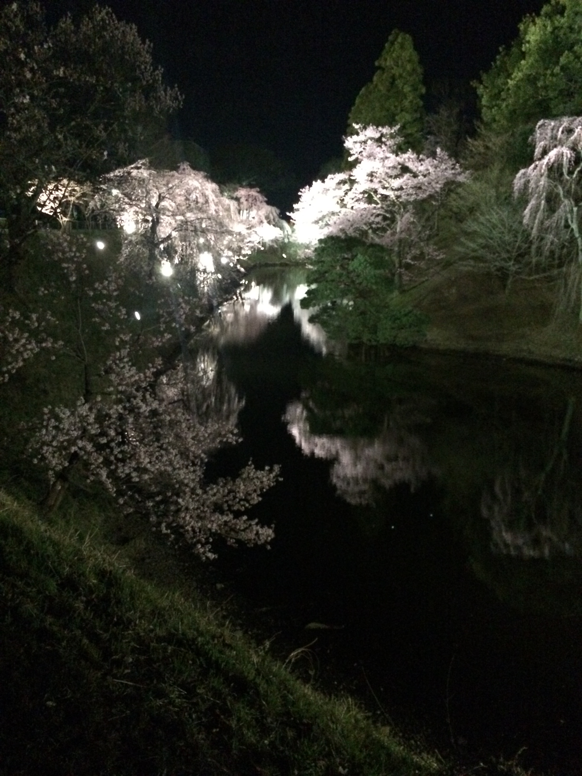 お堀にうつる夜桜にうっとり。