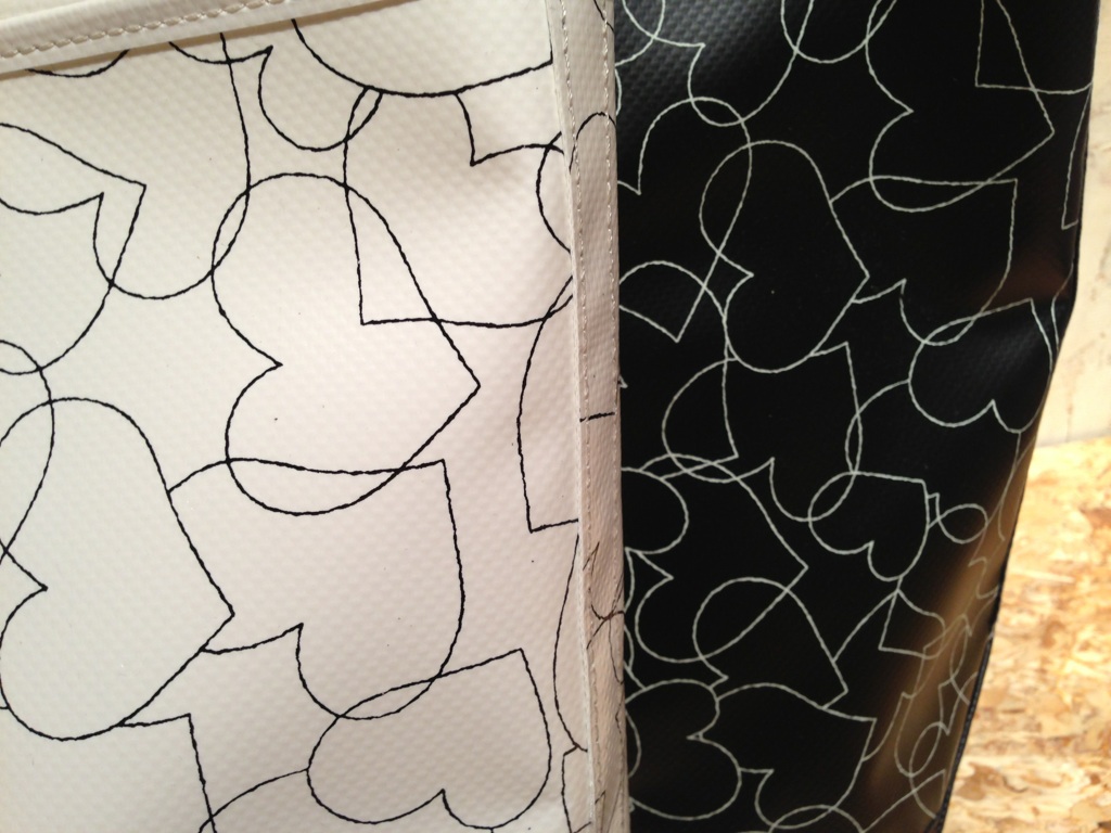 ターポリンに線描きのハートを散りばめたグラフィックをプリント。