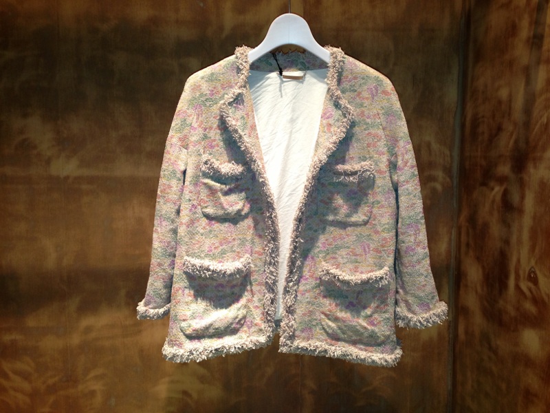 同素材のフリンジトリミングがかわいいツイードジャケット。