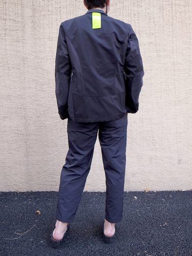 ボトムをスラックスにする事でより引き締まったスタイルに
