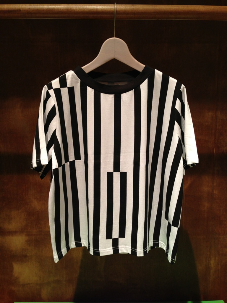 所々段違いにデザインされたストライプが印象的なTシャツ。