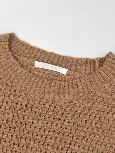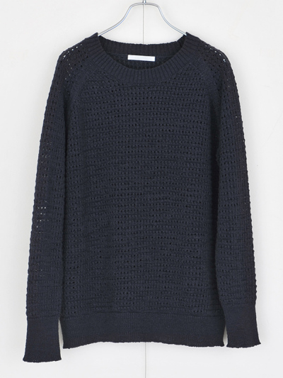 テープ状になったナイロンスラリット糸を使用したクルーネックニット。