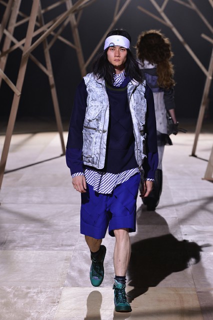 「MONTAGE」をテーマに、記憶の断片、重ねてきた経験、そして感情を形にしたという。今シーズンのインクジェットプリントはランウェイのセットと同様の木々の柄。オールドタトゥー柄のジャカードをコートに仕立て、バッファローチェックのシャツはフリルやフリンジで飾られた。プリーツを重ねたショーツやキルティングのライナー、ムートンのオーバースカートなど、少し土臭いアイテムを得意のレイヤードでマッシュアップしている。男女のボーダー、モードとストリート、あらゆるカルチャーが混ざり合い、より力強いプロポーションが完成。