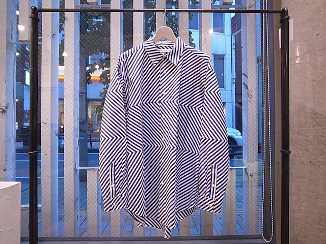 高密度の打ち込みのストライプのシャツ地を段の切り替えでバイアス使いにして柄を表現しています。切り替え部分のストライプの柄合わせなど細部にも拘りが伺えます。