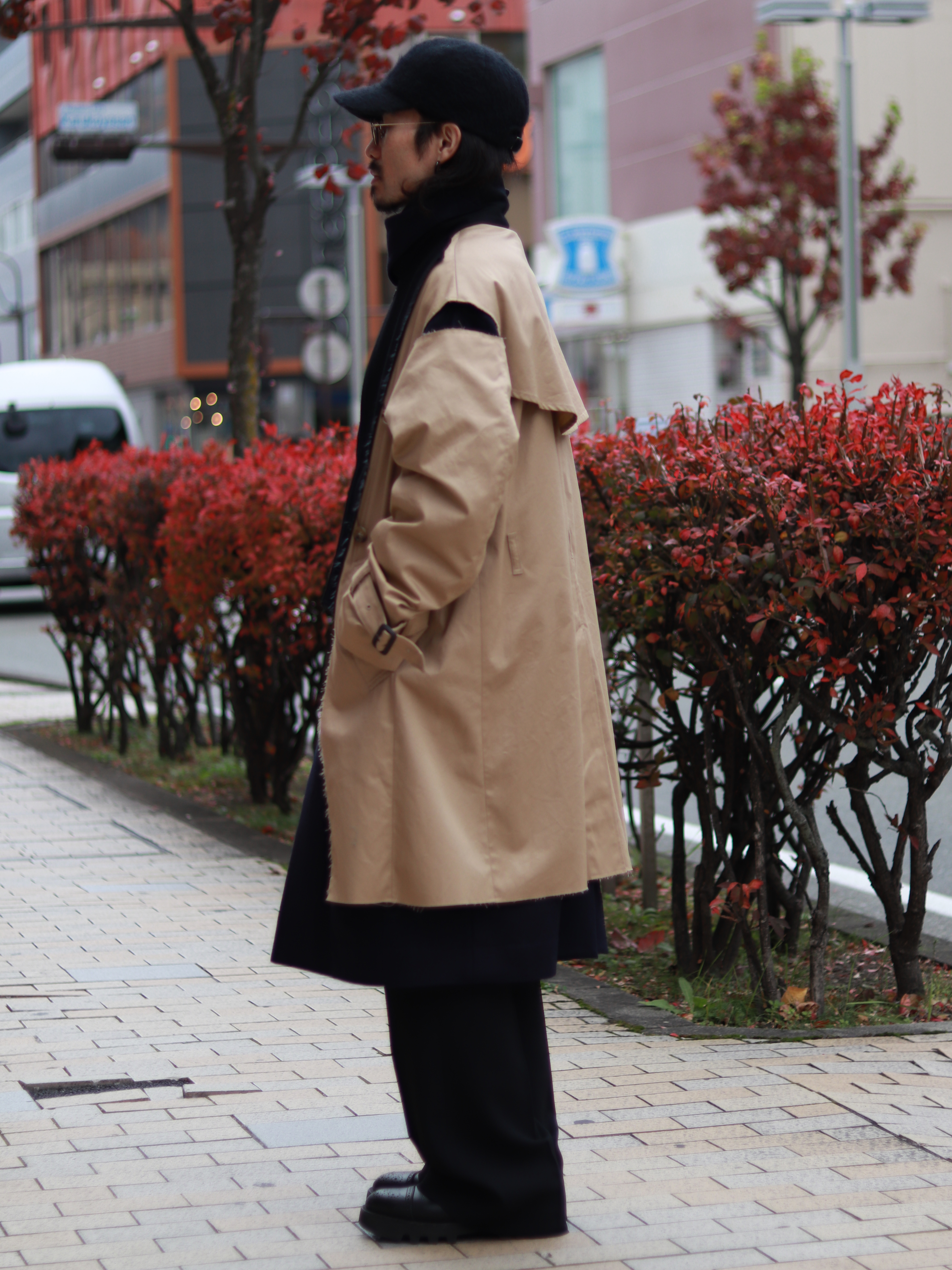BOOMERANGショップスタッフ丸山と今井による、2022年シーズンに抑えておきたいアウターのご紹介です。アイテムの特長やディティールは勿論ですが、BOOMERANGらしいコーディネートの組み合わせを踏まえながら、お勧めのアウターについて語り合っています。 emulation / Expansion Coat今年もこのシーズンがやってきましたね。去年のアウター特集から一年経ちますね。 本当にあっという間ですね(苦笑)去年同様、今年もBOOMERANGはしっかりとアウターを取り揃えてはいますが・・・その中で選りすぐりの一着をご紹介するコーナーですね。毎年恒例になりそうです(笑) 今年のアウター特集はアイテム紹介もしつつ、当店らしいスタイリングも交えてご紹介できたらと思います。まずはemulation(エミュレーション)ですね。BOOMERANGで今季より取り扱いを始めたテック系の新ブランドです。 このアウターの最大の特長は空気を充填することのできる特殊なユニットが付属されていることですね。空気を挿入することにより、ダウンや中綿の代わりに「空気」そのものを遮熱材として使用できるんですよね。 空気の充填により冬場のアウターとしても活用でき、春や秋のライトアウターとしても使用できる優れものですね。テック系アイテムだけどカジュアルにもモードにも触れるソリッドなカッコ良さもいいですね。 今回ご紹介したemulationのコートはブラックカラーのワントーンコーディネートで合わせましたね。 このスタイリングの特長は、テック系アイテムを中心としたレイヤリングですね。トップスにはLANTERNのHEATING INNER VEST。その上にtilak(ティラック)のStinger Paclite PLUS JACKETを羽織り重厚感を演出してますね。 アウトドアっぽい雰囲気に偏りすぎず、モードな雰囲気に纏めたのがポイントですね。 あと、インナーにDAIWA PIER39のTECH HIGH NECK TEEを合わせたのも良いですよね。首元にもボリュームを持たせた秋冬ならではの組み合わせですね。 そうですよね!秋冬では定番の組み合わせですけどテック系アイテムで纏めることで、より新鮮に感じますよね。今回のようにハイスペックのアイテムを掛け合わせるのもファッションの醍醐味だと思います。emulationのExpansion Coatも組み合わせ次第で様々な変化が楽しめるので、タウンユースに落とし込みながら着回しを楽しんでもらえたら嬉しいですね。 STAFF着用アイテム emulation(エミュレーション) DAIWA PIER39(ダイワピア 39) LANTERN(ランタン) tilak(ティラック) POLIQUANT(ポリクワント) 他私物 AUBERGE / ECOLEAUBERGE(オーベルジュ)も今回の秋冬から取り扱いを始めた新ブランドですね。AUBERGEはなんと言ってもこの味わい深い表情ですよね。フレンチヴィンテージの魅力が詰まっていますよね。 この渋さが良いですよね。今回ご紹介するECOLEも凄くカッコ良いんですよね。80年代のバーバリー社製のコートを再構築していて、現代的にアレンジが加わっているので。玄人好みな一着でもありつつ、長く愛用することを前提に取り組んでいるのが伝わりますよね。 今回のスタイリングはスタンダードなアイテムで合わせていますよね。このスタイリングのこだわりはどこでしょう。 このECOLEの魅力を最大限に引き立てられたと思いプレーンに纏めていますね。ボトムスにはAUBERGEのTROIS BAGS Ⅱ、トップスはmfpen(エムエフペン)のReception shirtにSTANDARD CALIFORNIAのSD Mohair Cardiganを合わせています。トップスに色物を取り入れることでアウターをより引き立てるようにスタイリングを組み合わせましたね。 シャツにカーディガンは王道ですよね。クリーンな表情で間違い無いですよね。 他にも厚手のニットやスウェットにも相性良いので・・・幅広い着こなしが可能ですよね。もっとカジュアルダウンさせた着こなしも良さそうです。 そうですね・・・例えば僕だったら古着などに合わせても雰囲気良いかなと。アメカジっぽい雰囲気に落とし込んでも面白そうです。 良いですね(笑)ちょっと土臭い雰囲気を醸し出した着回しも楽しめそうですね。元々ヴィンテージ感が強い一着なので、流行には左右されにくいコートですからね。 STAFF着用アイテム AUBERGE(オーベルジュ) mfpen(エムエフペン) STANDARD CALIFORNIA(スタンダードカリフォルニア) AUBERGE(オーベルジュ) COMESANDGOES(カムズアンドゴーズ) FACETASM(ファセッタズム) モデル身長:身長171cm FACETASM / LAYERD DECONSTRUCTED TRENCH COAT続いてはFACETASM(ファセッタズム)のLAYERD DECONSTRUCTED TRENCH COATですね。このコートの作り込みは凄いですよね。お客様からもお褒めの言葉を沢山いただいているアウターです。 FACETASMの代名詞的一着ですね。ストリートモードを感じる仕上がりです。ベースはトレンチコートですが、メルトン素材をドッキングさせた独自のレイヤリングがカッコいいですね。カットオフされたディティールもこなれた雰囲気を醸し出していますね。 今回のスタイリングでは、あえてストリートっぽい着こなしをせずに、どちらかというとスタンダードなアイテムを合わせていますね。シンプルに合
