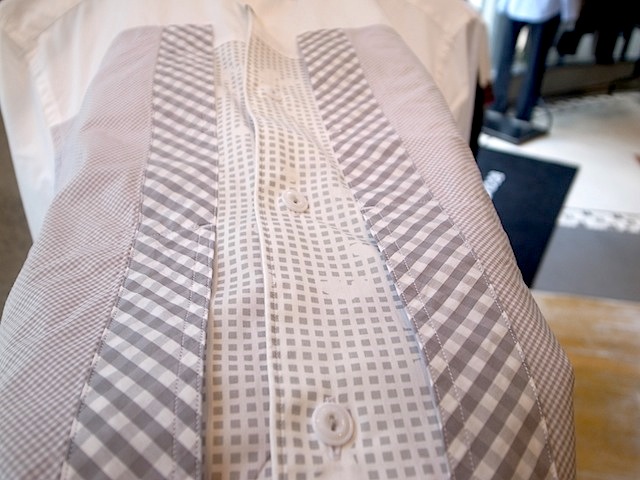 胸部ポケット、ボタン部にそれぞれ異なるギンガムチェックを葦らうことで、