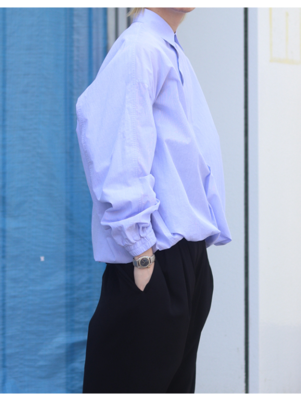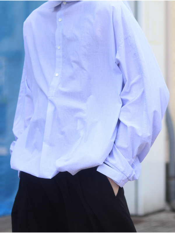 爽やかな青いシャツは、シンプルでありながらコーディネートに清涼感と品のある印象をプラスしてくれます。