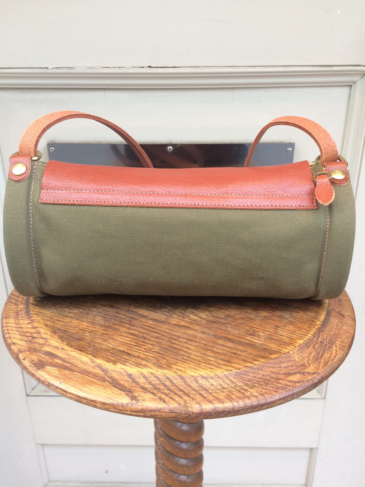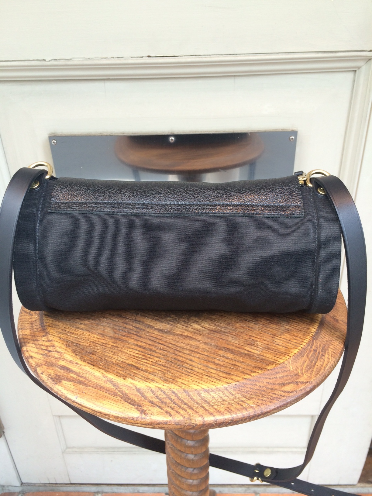 蓋の部分と持ち手にオリジナルレザーを使用、キャンバス地なので軽くて持ちやすいです。