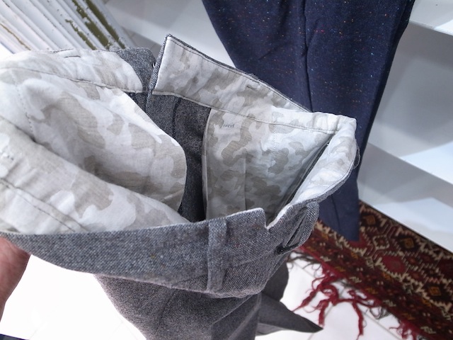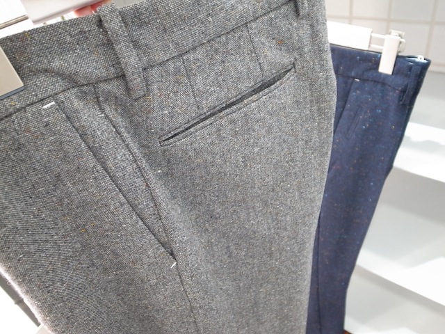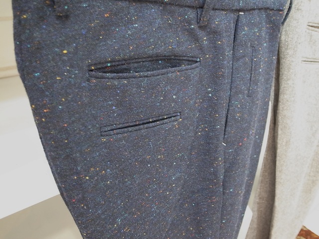上記のジャケットと同素材のオリジナルで仕立てたカラーネップホームスパン生地を使用したセンタープレス入りトラウザーズテーパードパンツです。