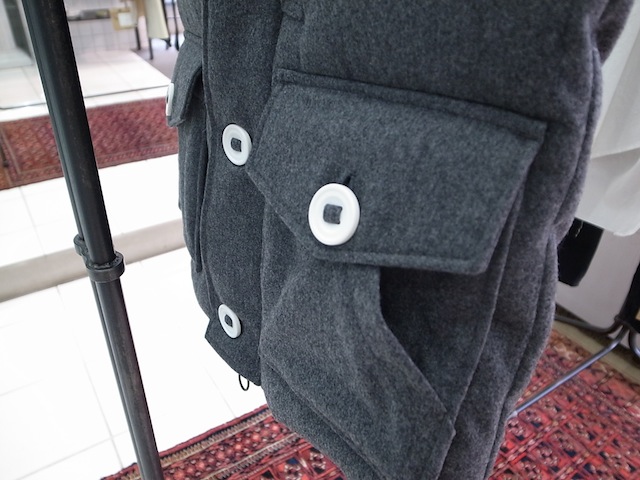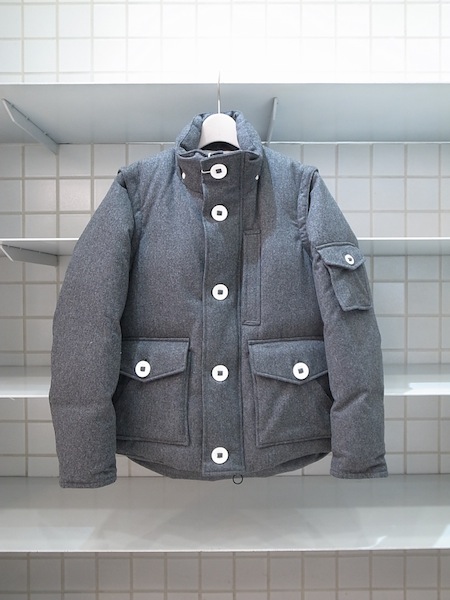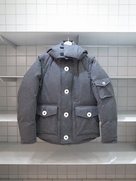 上質なウールの持つ柔らかさと光沢感を持つウールの中でも最も上質と言われるオーストラリアタスマニア州のメリノ種の羊毛をもちいたタスマニアウールフランネル地をボディーシェルに使用したベストモデルとしても活用可能な脱着袖にフードに大きめなミリタリーボタンが特徴のミニマムサイジングにアウター機能性とファッション性を兼ね備えたダウンジャケット。