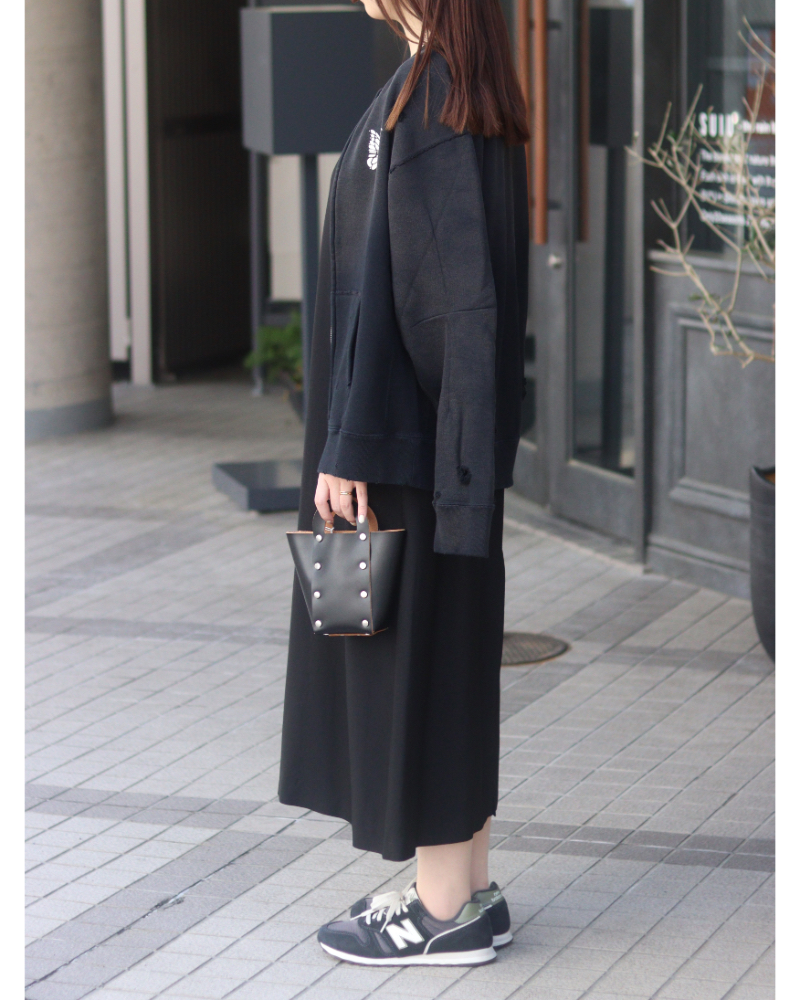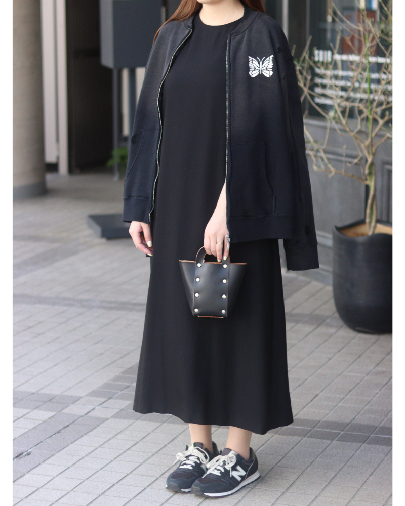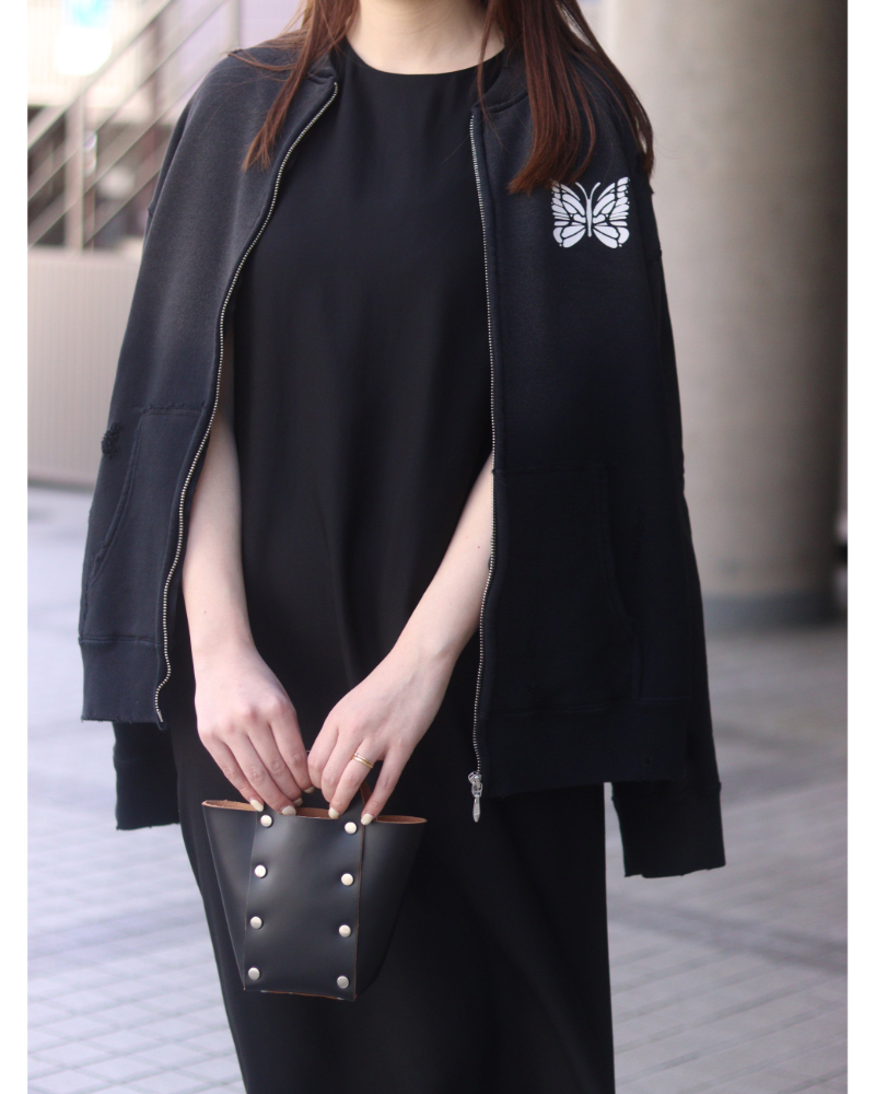 NEEDLESの新型のスウェットカーディガンにGraphpaperのバックサテンドレスを合わせました。