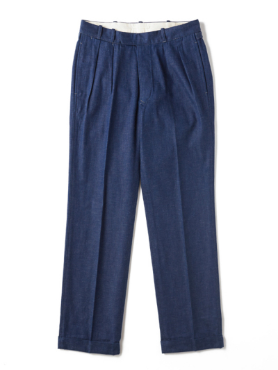 青みの強いミッドセンチュリー期のイギリス軍を彷彿させるようなインディゴデニムを用いて制作したアーミーチノトラウザー。