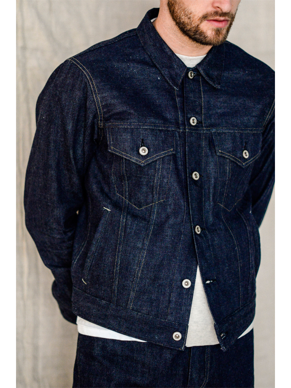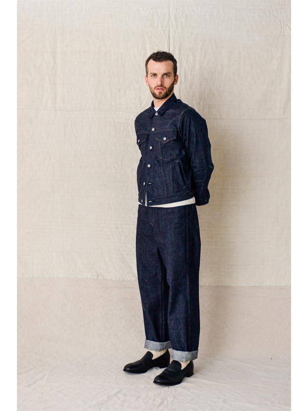 OLD JOE STANDARD DENIM…..オールドジョーのオリジナルレシピとなります。 糸からの制作となり、デニムの産地井原にて経糸にムラ、ネップ形状の強いものを前回のものより黒いインディゴ染料で染色しています。