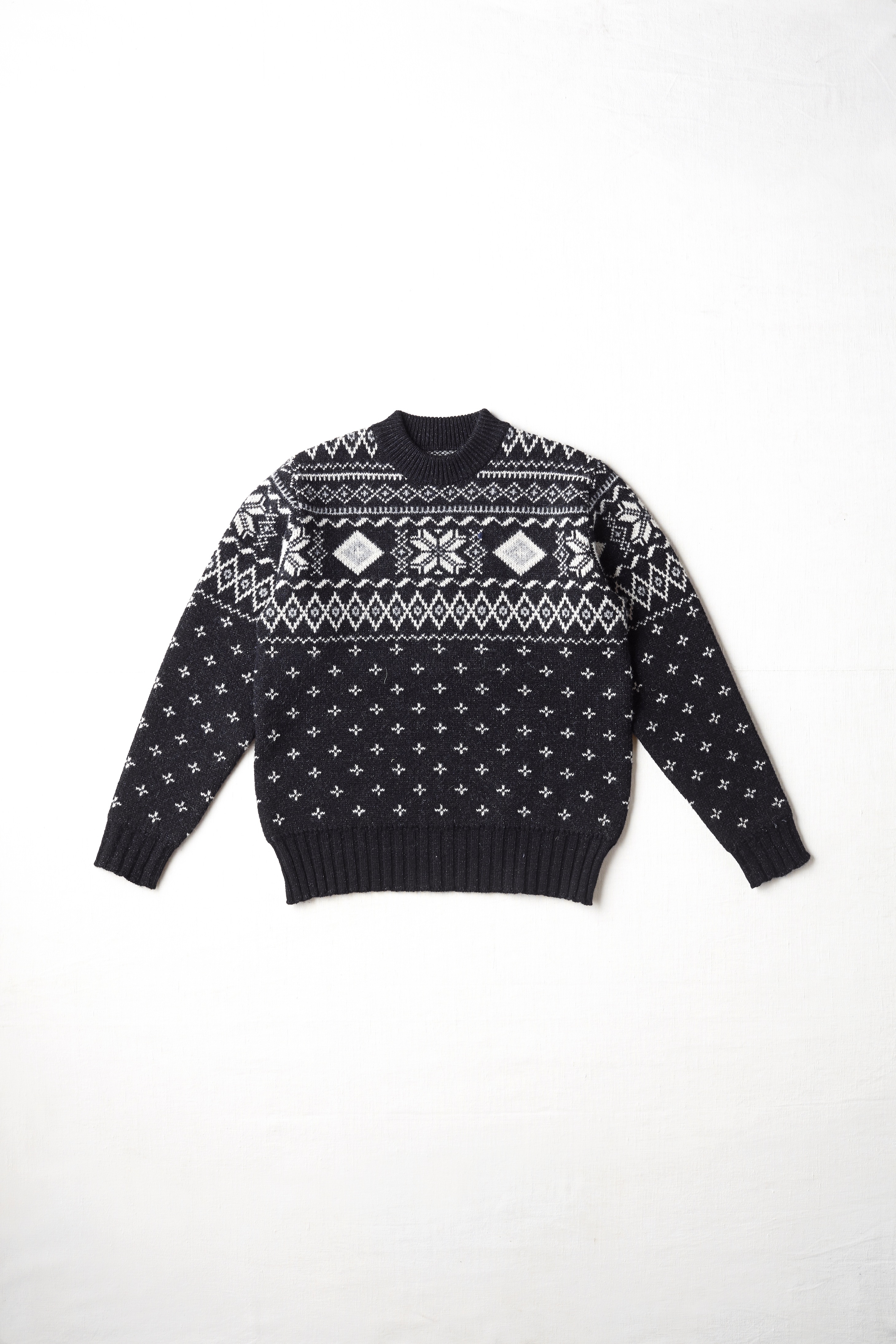 英国産ウールとインディゴヤーンコットンをツイストして編み込んだしっかりと目の詰まった肉厚なノルディク柄のセータになります。