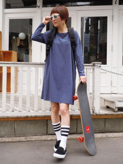 NAVYは、バックパックやラインソックス、VANSを履いてストリート感溢れるスタイルに。