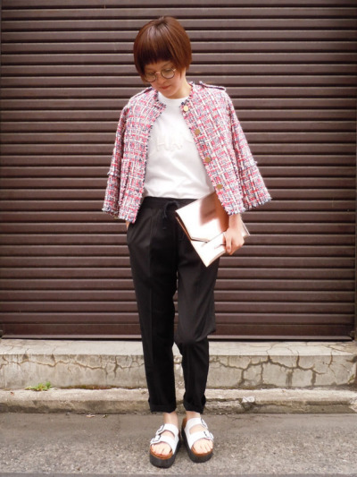 インパクトのあるツイードジャケットに、あえてTシャツとサンダルを合わせたMIXスタイルにも、BLACKがいい具合に締めてくれています!!