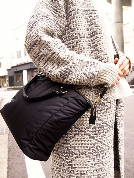 肩に掛けたMUVEILのバッグは、キルティング素材なので安定の軽さで、こじんまり感がやっぱり可愛い♪♪