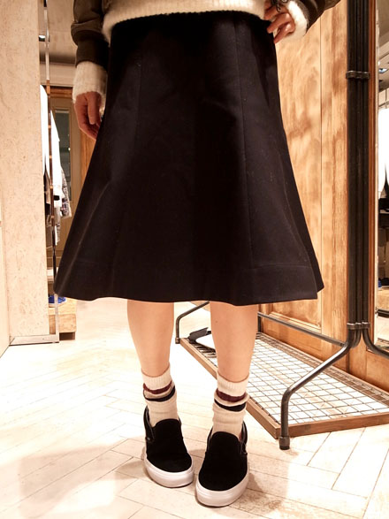Leeとのコラボアイテム、ヒッコリースカートに、ロゴ裏毛トップスをインしてみました。