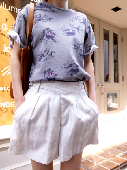sueのトップスは手書き風の花柄プリントが可愛く、ゆったりめのシルエットですが素材がしっかりしているのでやぼったくならず、絶妙なバランスです。