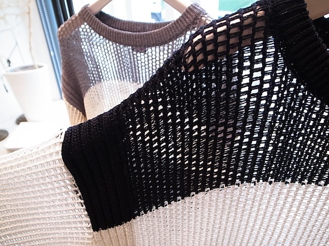 バイカラーになったデザインと透け感が特徴、身頃両端部分のみ編み方を変えています。