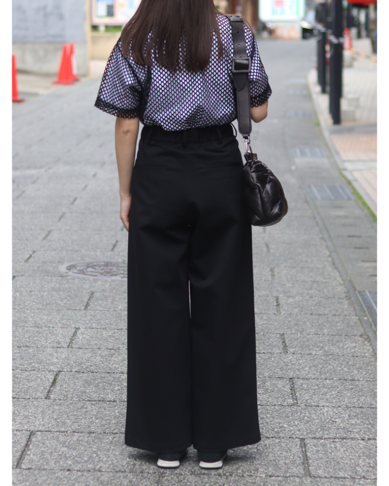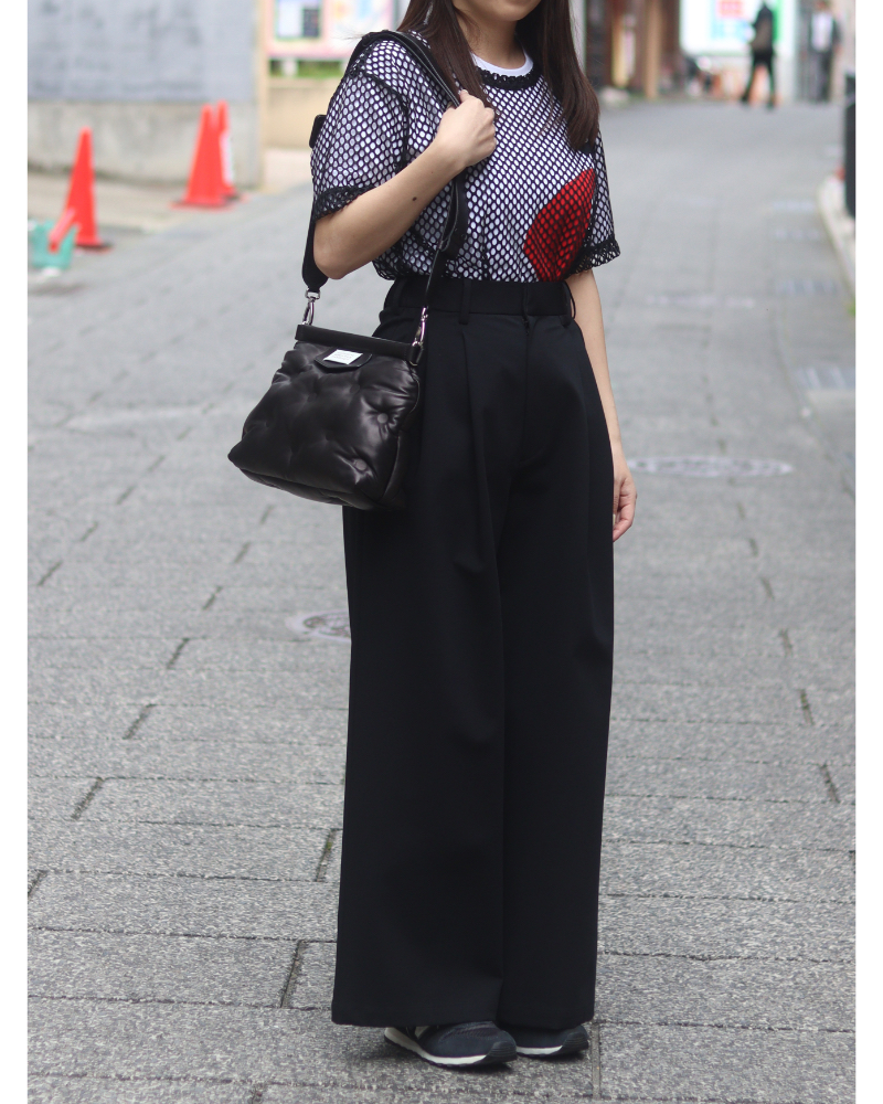 ボトムスは無駄を削ぎ落としたシルエットの黒のスラックスをセレクト。