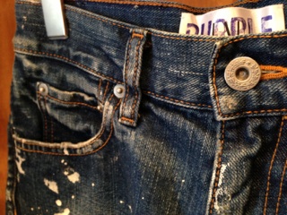 コットン生地にピン打、軽石バイオ、シェービング柔軟を加えた後にペンキ加工を施した