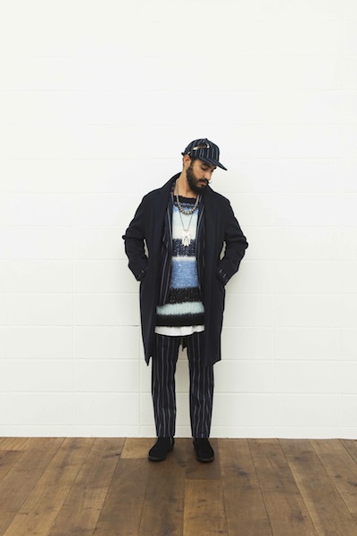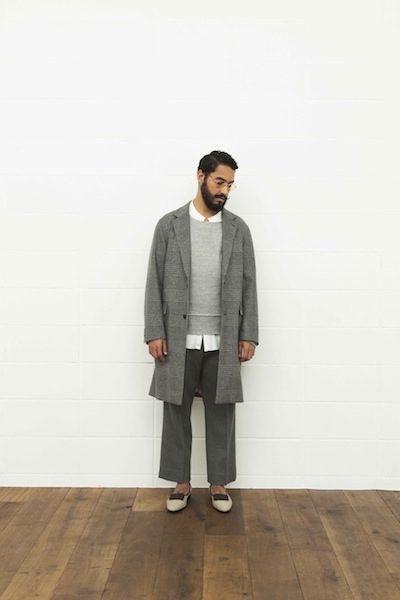 上品なコートに敢えてストリート感のあるアイテムとミックスして着用する、そんな提案をしています。