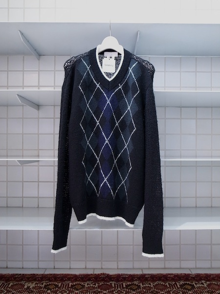 フロントはアーガイル柄、バッグがローゲージ編みの切替が斬新な一着です。