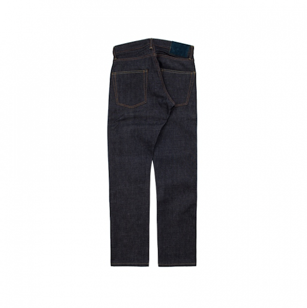 スリムフィットのテーパードシルエット。オリジナル鉄製ネオバ釦を使用、リベットには藍染めを施したディアスキンパッチ使用となります。右後ポケット内ジップポケットがございます。